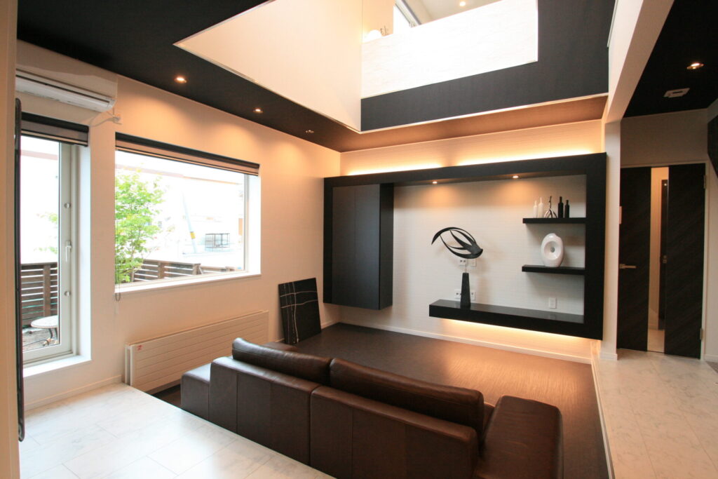 【御夫婦・わんちゃん2匹の住宅】 目の前に緑の大パノラマが広がる居室では趣味のギターを弾く寛ぎの場になりました。伸び伸びリビング天井は高さ3mを誇り、重低音のサラウンドシステムを搭載しています。小上がりの堀こたつのある和室では足元からの... -